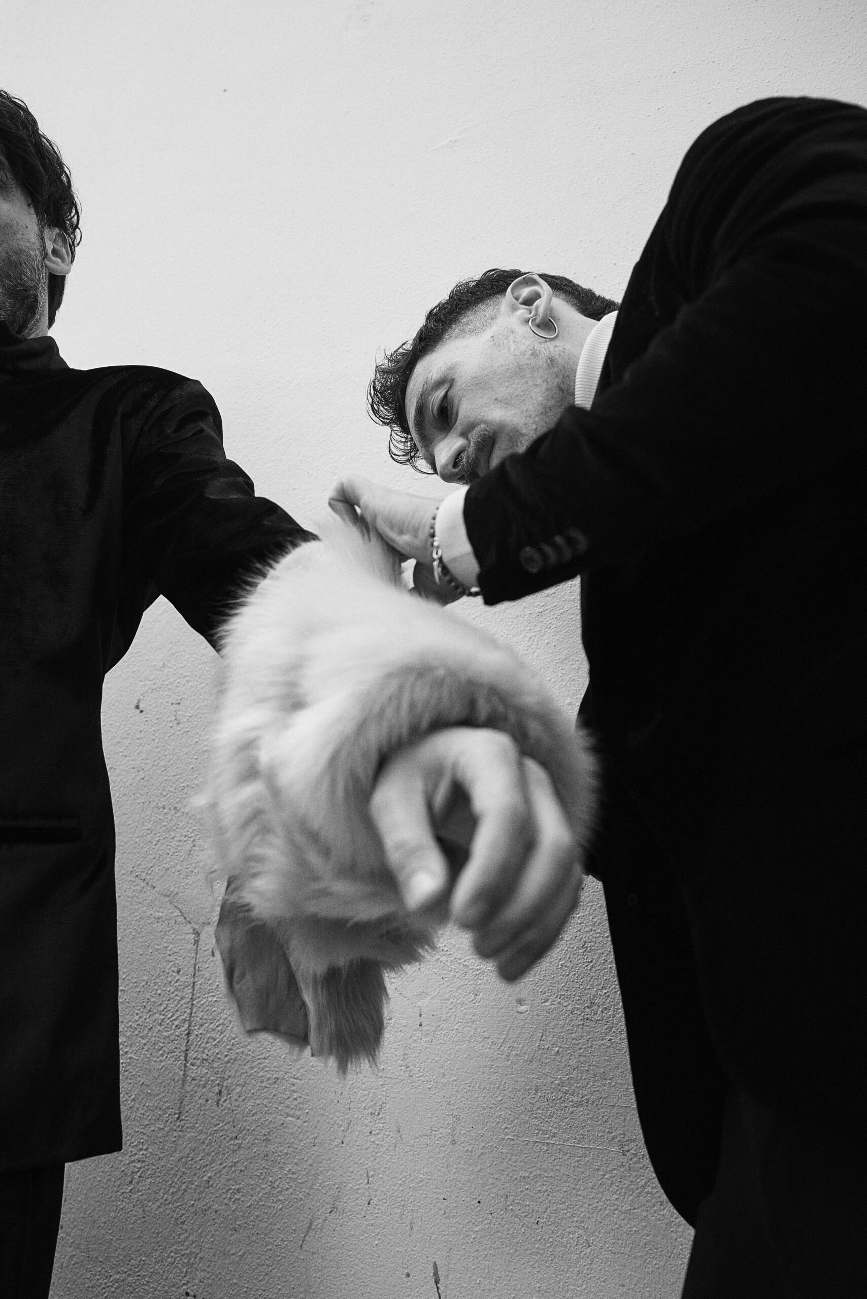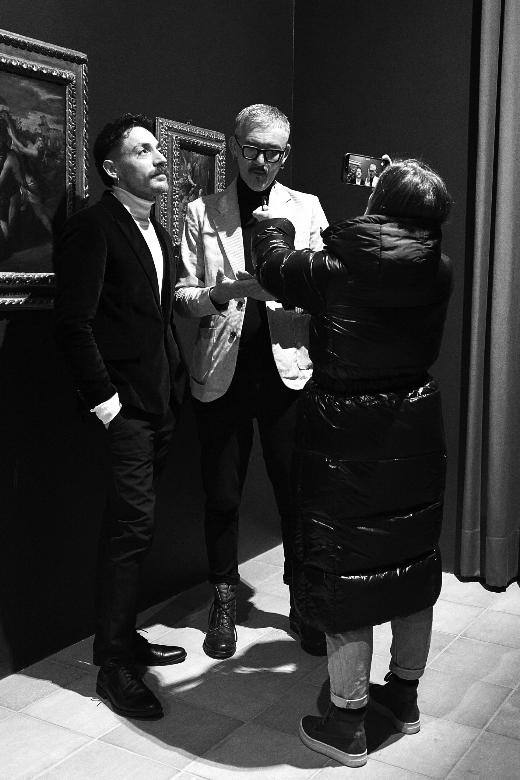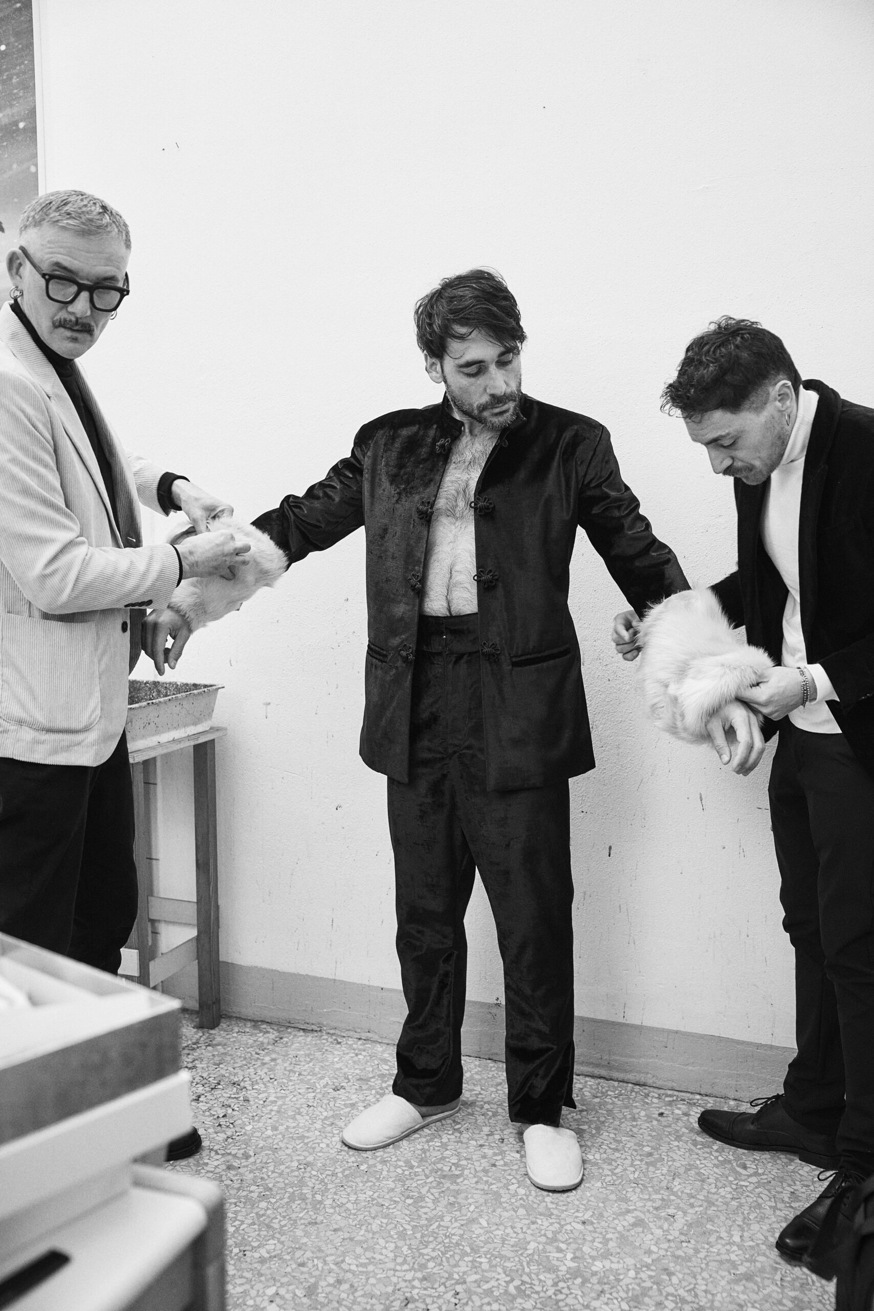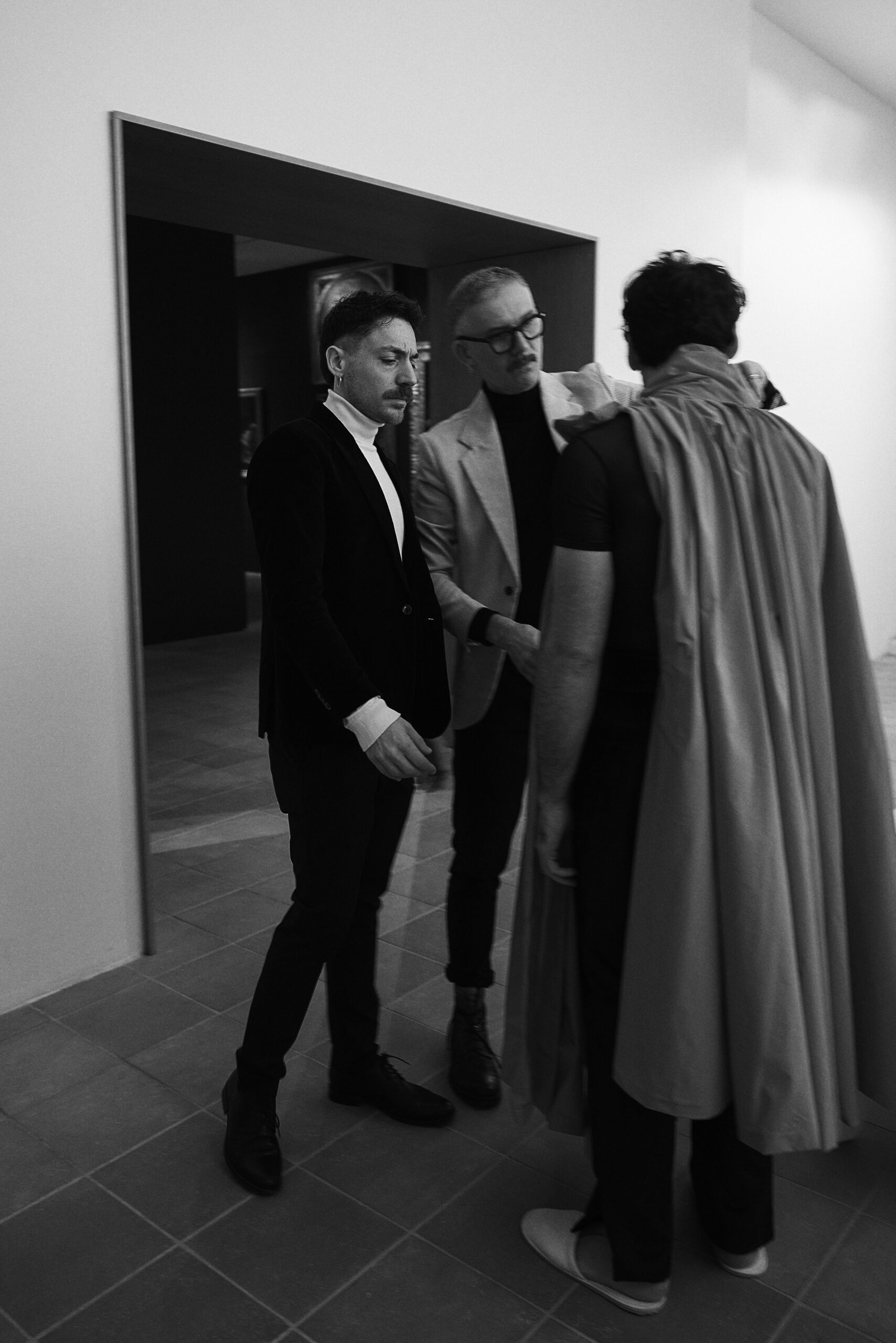 Il progetto nasce da un’amicizia profonda e da una visione estetica condivisa. I designer Davide Muccinelli e Calogero Insalaco hanno saputo tradurre il carisma di Davide Mancini in pezzi unici di Alta Moda contemporanea.
