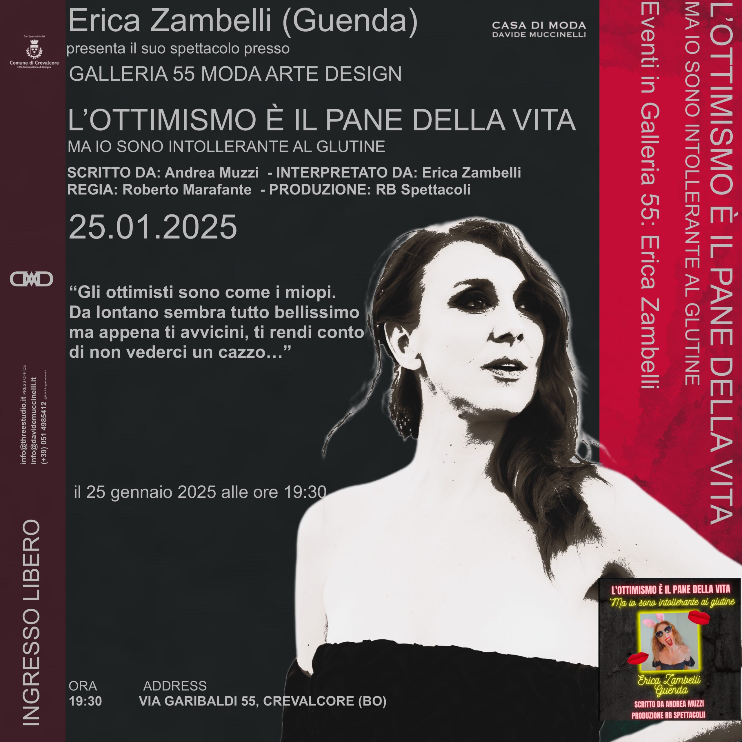 Sabato 25 gennaio un successo in Galleria 55 Moda Arte Design a Crevalcore (Bologna). La puntata zero della stand up comedy “L’ottimismo è il pane della vita ma io sono intollerante al glutine”, interpretata da Erica Zambelli.