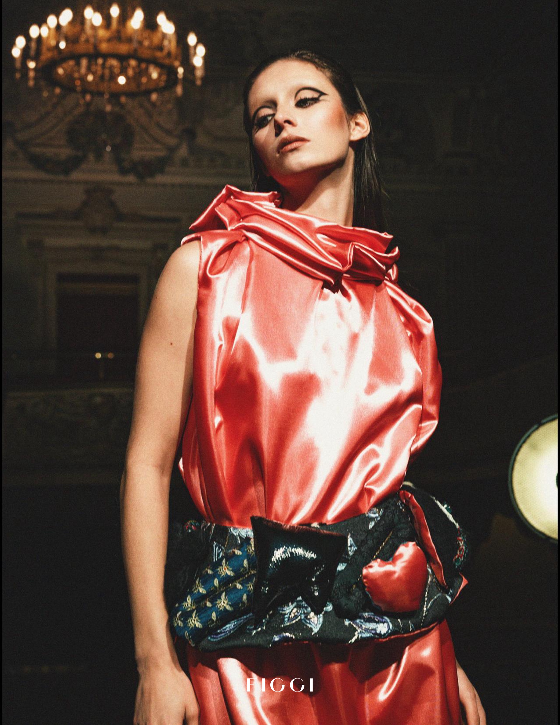 Le maschere di Pirandello, simboli di identità sfuggente e di mistero, si presentano come un perfetto parallelo alla complessità degli abiti. Ogni indumento è una dichiarazione di intenti: tessuti pregiati e tagli audaci si accompagnano a volumi straordinari, trasformando le modelle in autentiche muse, come se avessero attraversato il tempo per rivivere la loro epoca dorata.