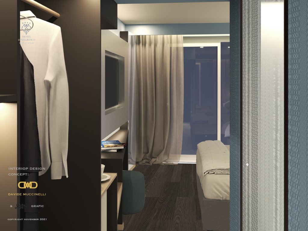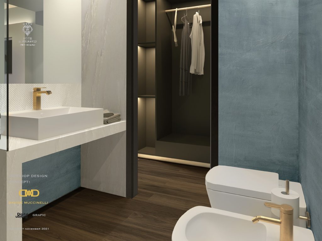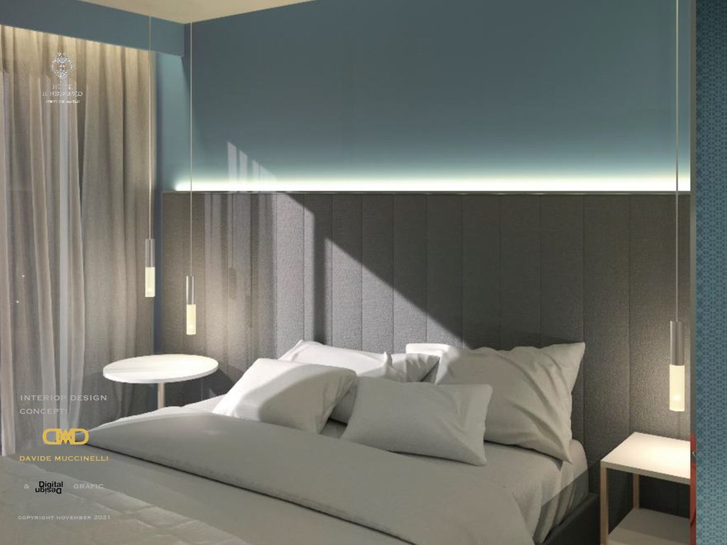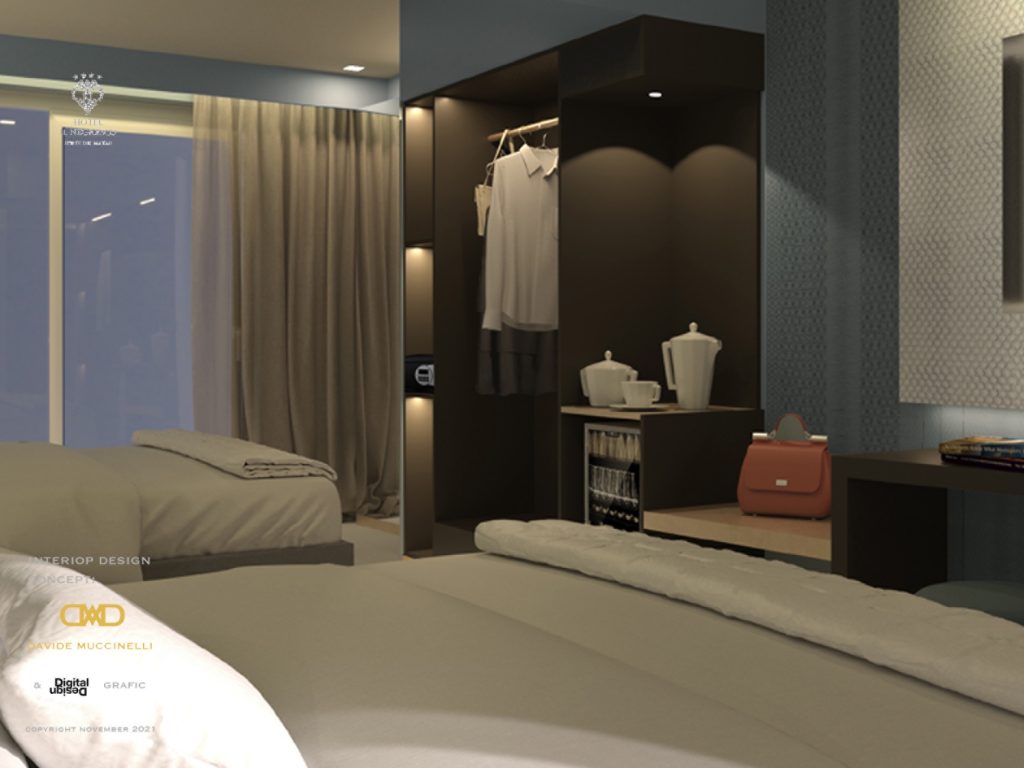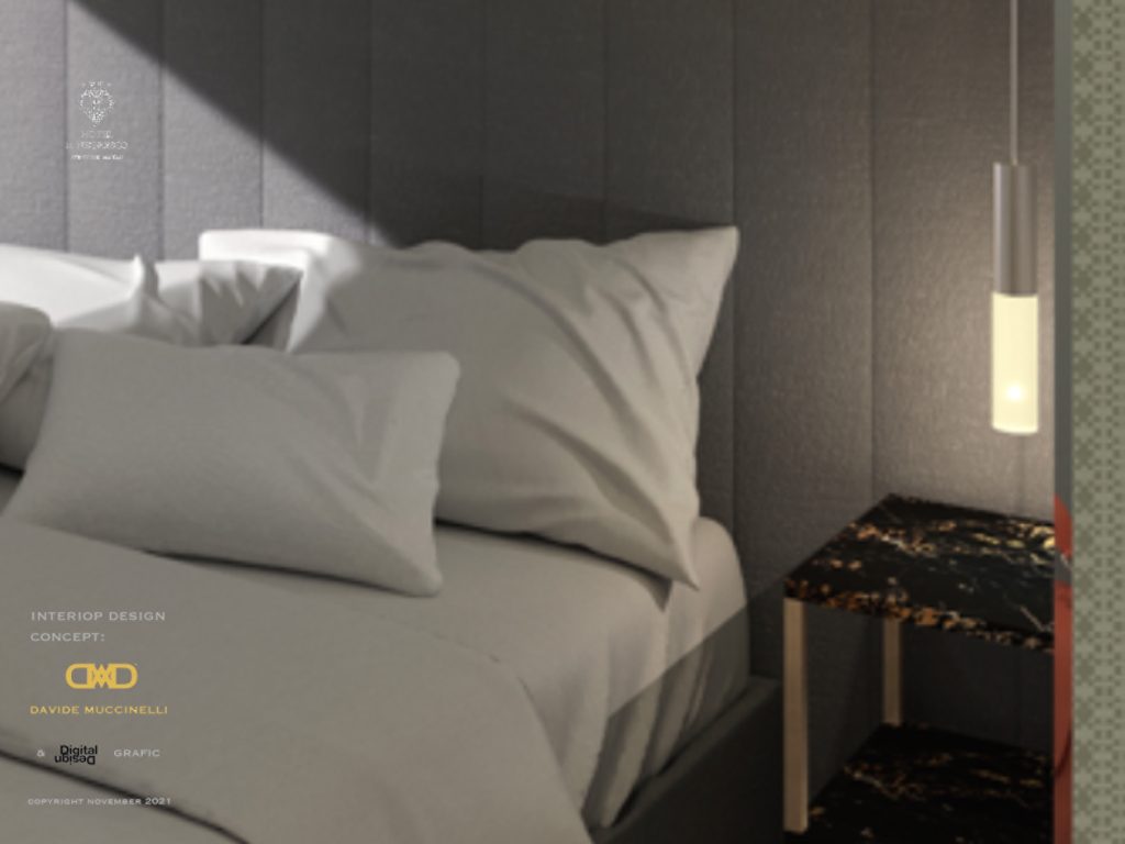 Davide Muccinelli Project. Un progetto di riqualificazione totale, per rendere gli spazi e l’intera struttura ricettiva più contemporanea. Un dialogo stilistico comune per le diverse aree che compongono l’Hotel, da quelle comuni alle camere, al roof lounge & bar; mantenendo attenzione alle singole funzionalità. Una vista unica fronte mare, la richiesta, di ottenere ambienti raffinati ed eleganti, questo è il target di riferimento. L’ interpretazione, una sapiente proposta di linee essenziali, trattate con materiali e cromie molto ricercate, dagli avori ai carboni per passare dalle finiture ebano agli ottoni; le ombre dettate da un sapiente progetto “luce”, definiscono silouette ed esaltano trasparenze come quelle ottenute dalla traslucenza degli onici e dei marmi trattati con inedite texture. Collaborazione con Mille997.