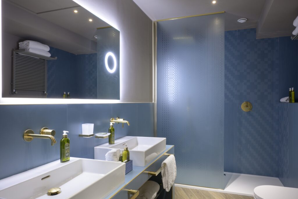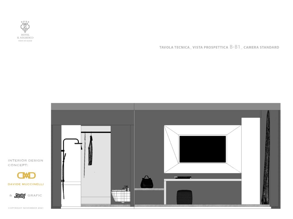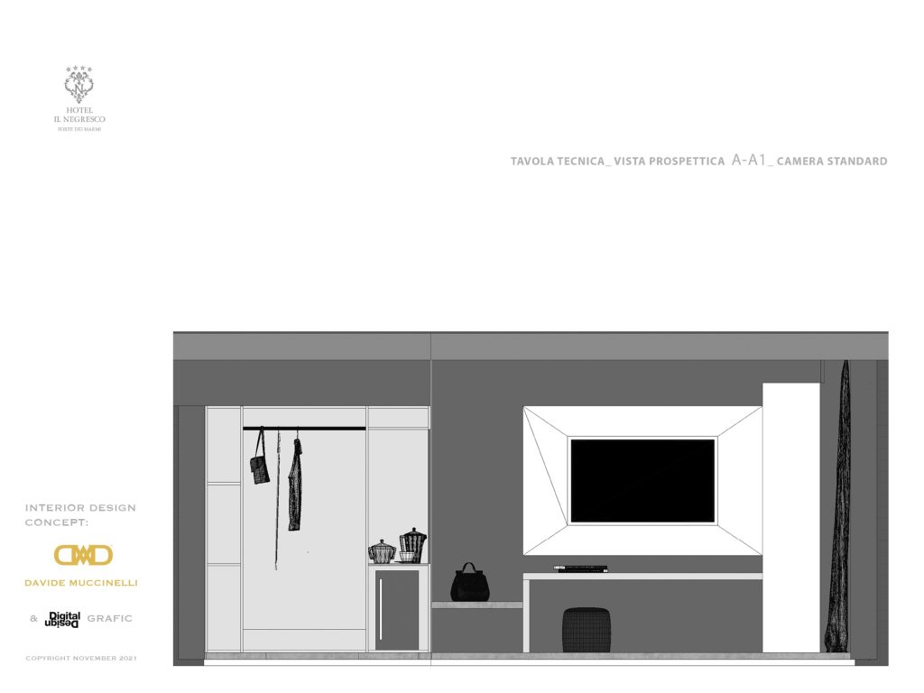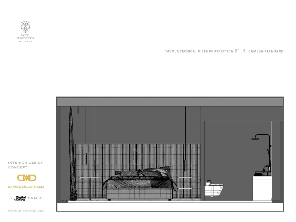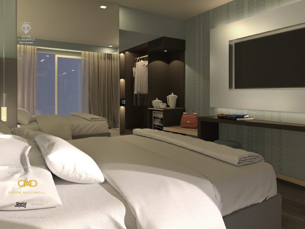 Davide Muccinelli Project. Un progetto di riqualificazione totale, per rendere gli spazi e l’intera struttura ricettiva più contemporanea. Un dialogo stilistico comune per le diverse aree che compongono l’Hotel, da quelle comuni alle camere, al roof lounge & bar; mantenendo attenzione alle singole funzionalità. Una vista unica fronte mare, la richiesta, di ottenere ambienti raffinati ed eleganti, questo è il target di riferimento. L’ interpretazione, una sapiente proposta di linee essenziali, trattate con materiali e cromie molto ricercate, dagli avori ai carboni per passare dalle finiture ebano agli ottoni; le ombre dettate da un sapiente progetto “luce”, definiscono silouette ed esaltano trasparenze come quelle ottenute dalla traslucenza degli onici e dei marmi trattati con inedite texture. Collaborazione con Mille997.