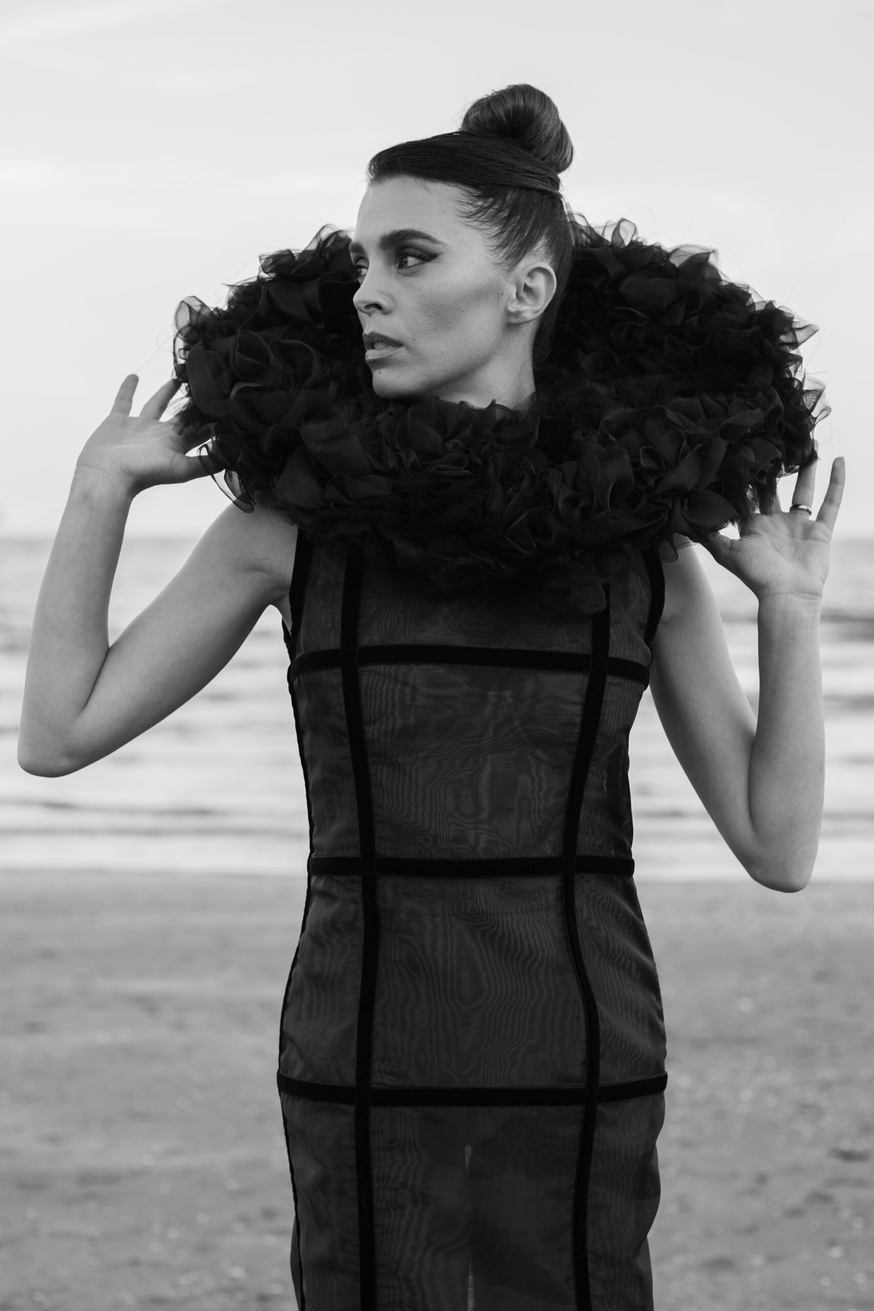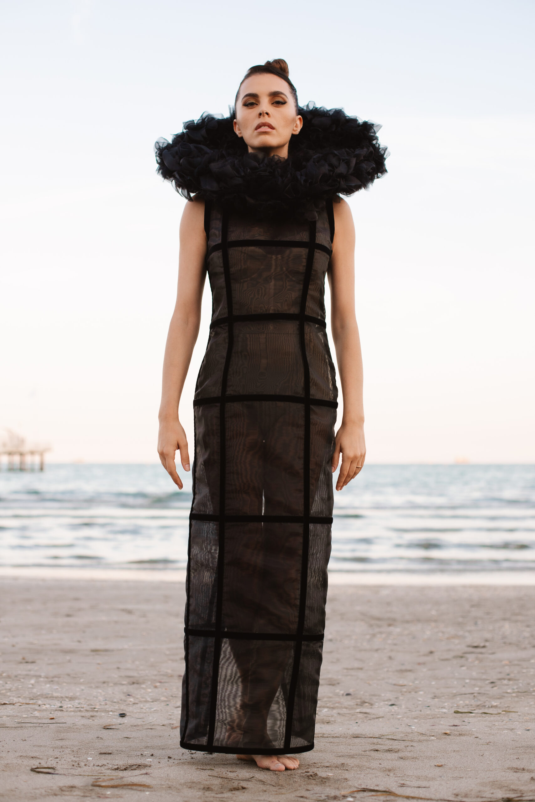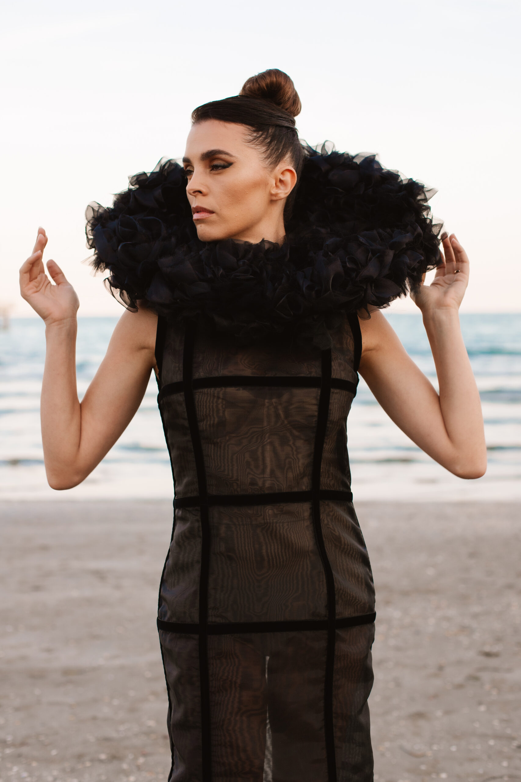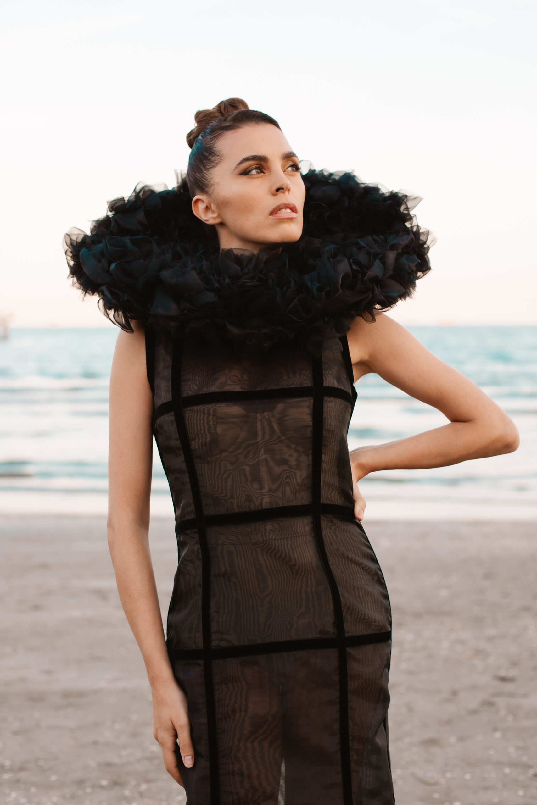Davide Muccinelli, con il suo talentuoso team, desidera omaggiare tutte le donne con l’architettura di questa creazione di alta sartoria, dove organze di seta e velluti si fondono in geometrie che sbocciano in un armonico bouquet. L’abito “FLOS” si presenta come una gabbia dark che esplode nella parte superiore con un’elaborata realizzazione di ruches a taglio vivo, simulando i fili di seta che lo compongono.