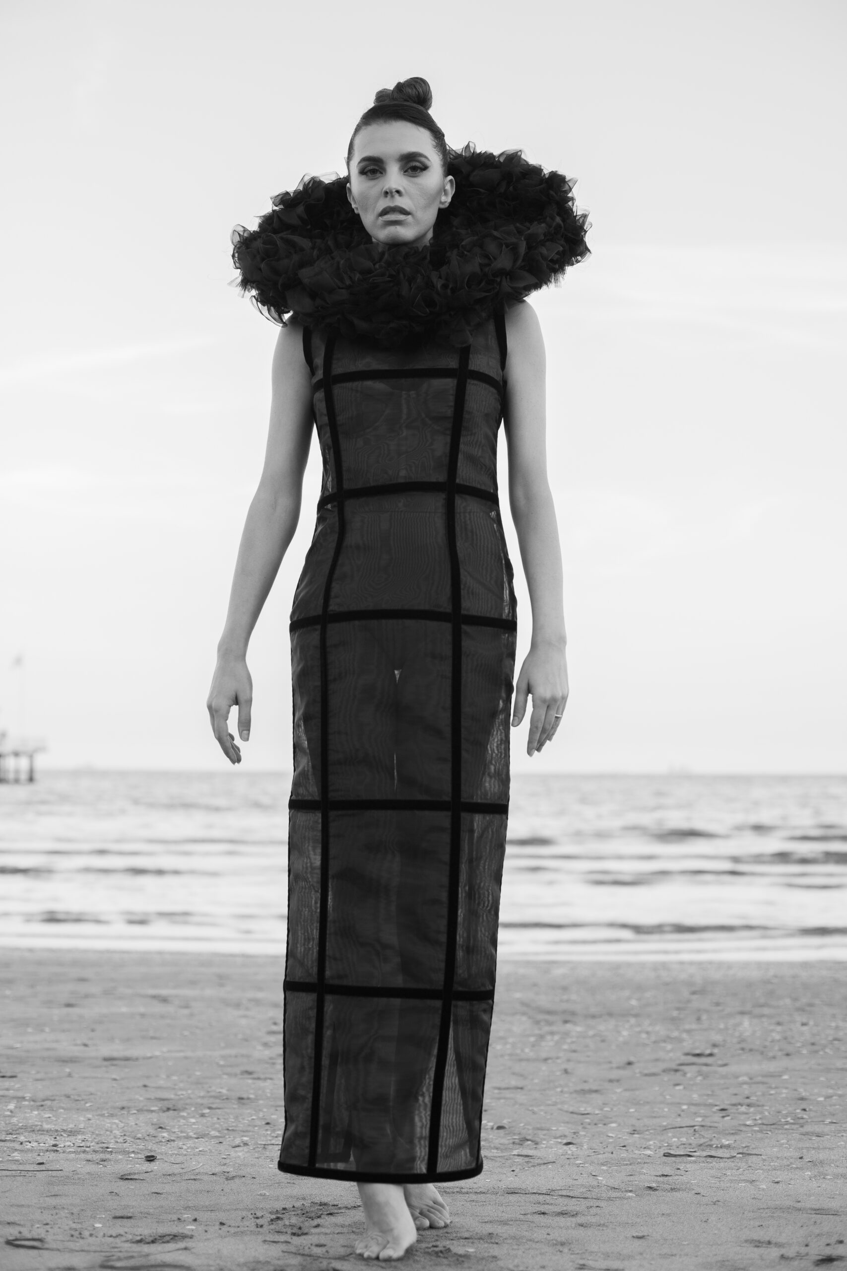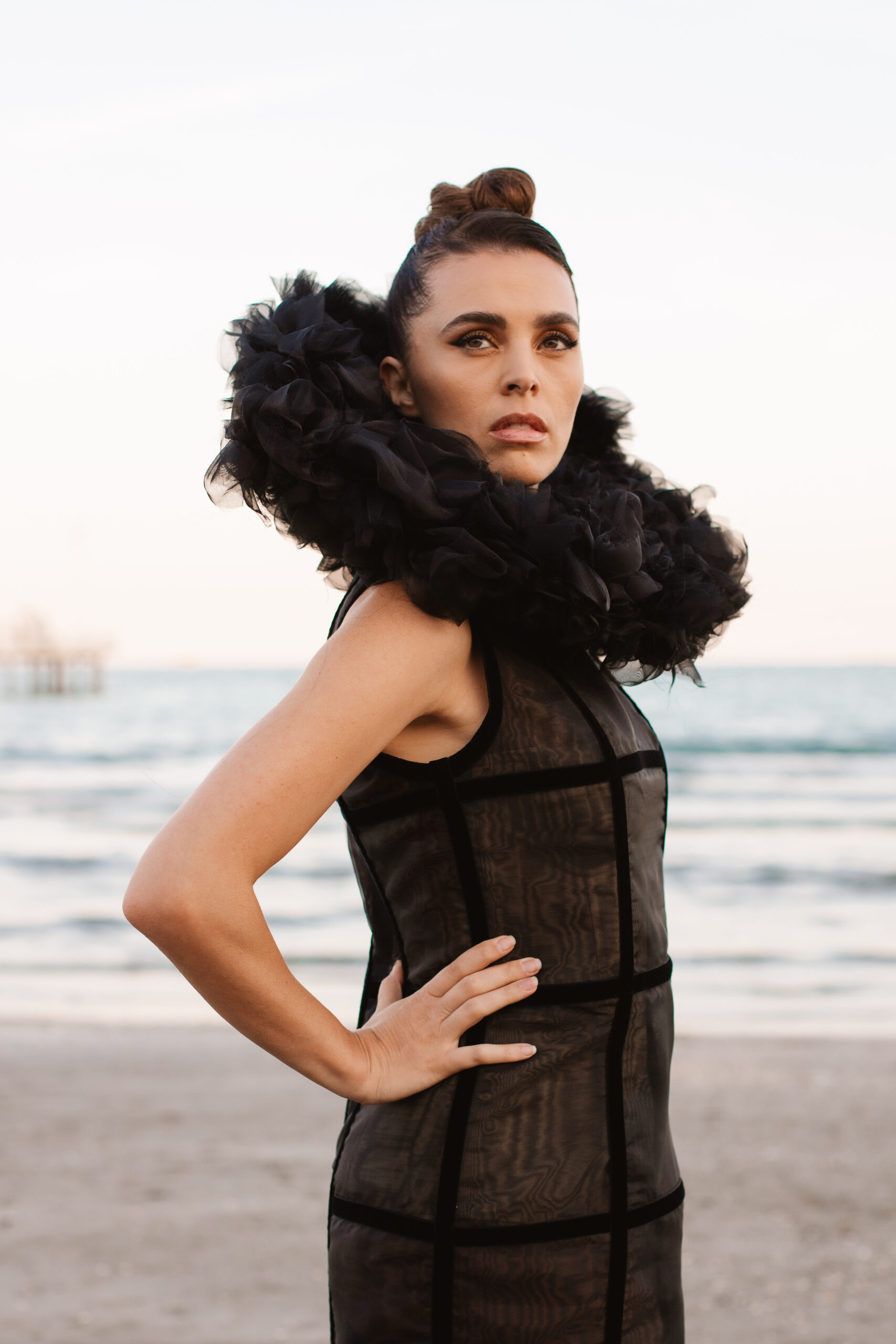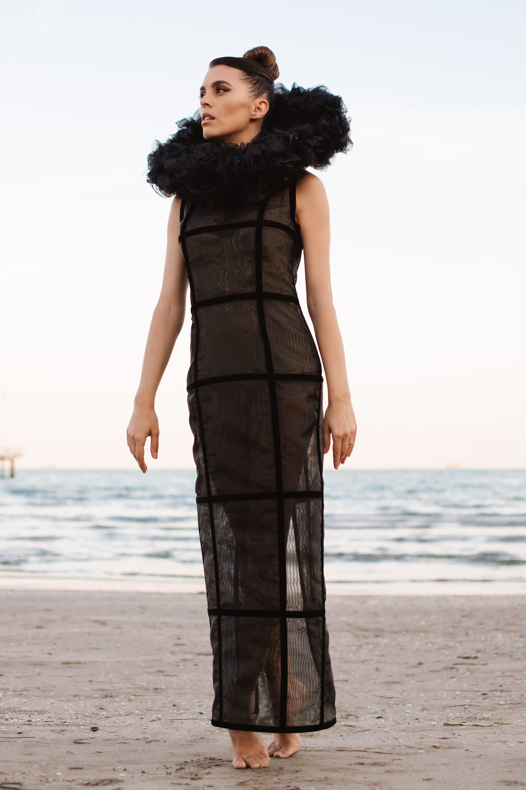 Davide Muccinelli, con il suo talentuoso team, desidera omaggiare tutte le donne con l’architettura di questa creazione di alta sartoria, dove organze di seta e velluti si fondono in geometrie che sbocciano in un armonico bouquet. L’abito “FLOS” si presenta come una gabbia dark che esplode nella parte superiore con un’elaborata realizzazione di ruches a taglio vivo, simulando i fili di seta che lo compongono.