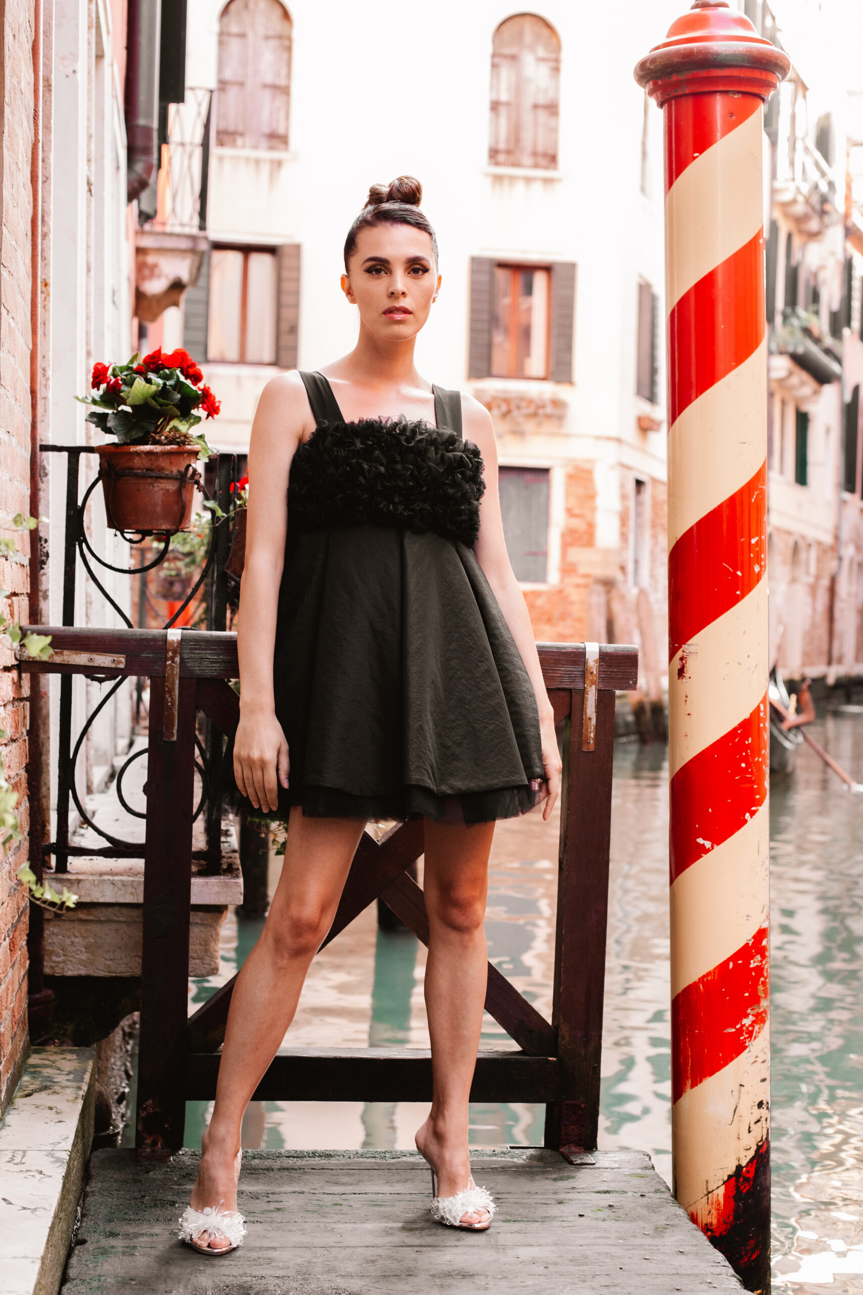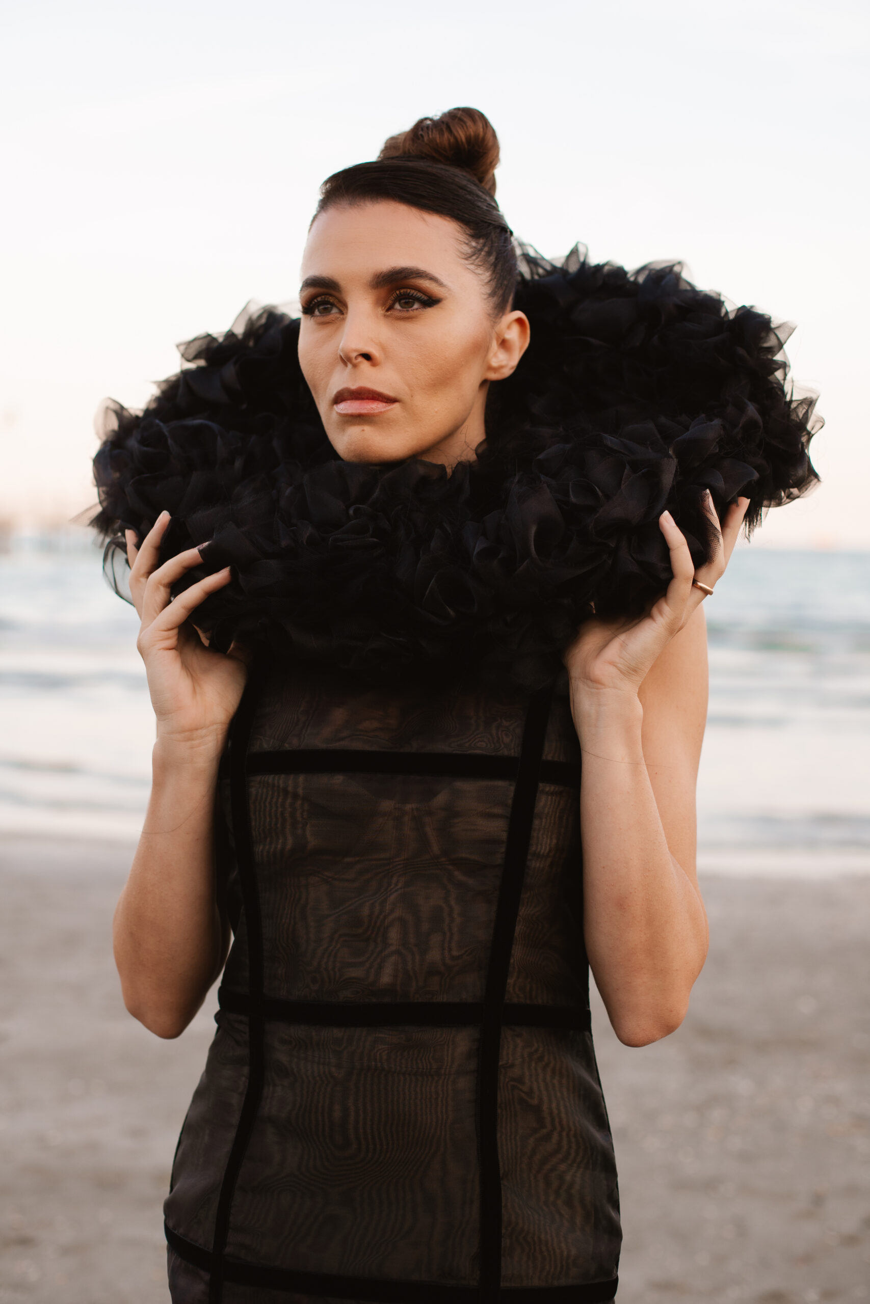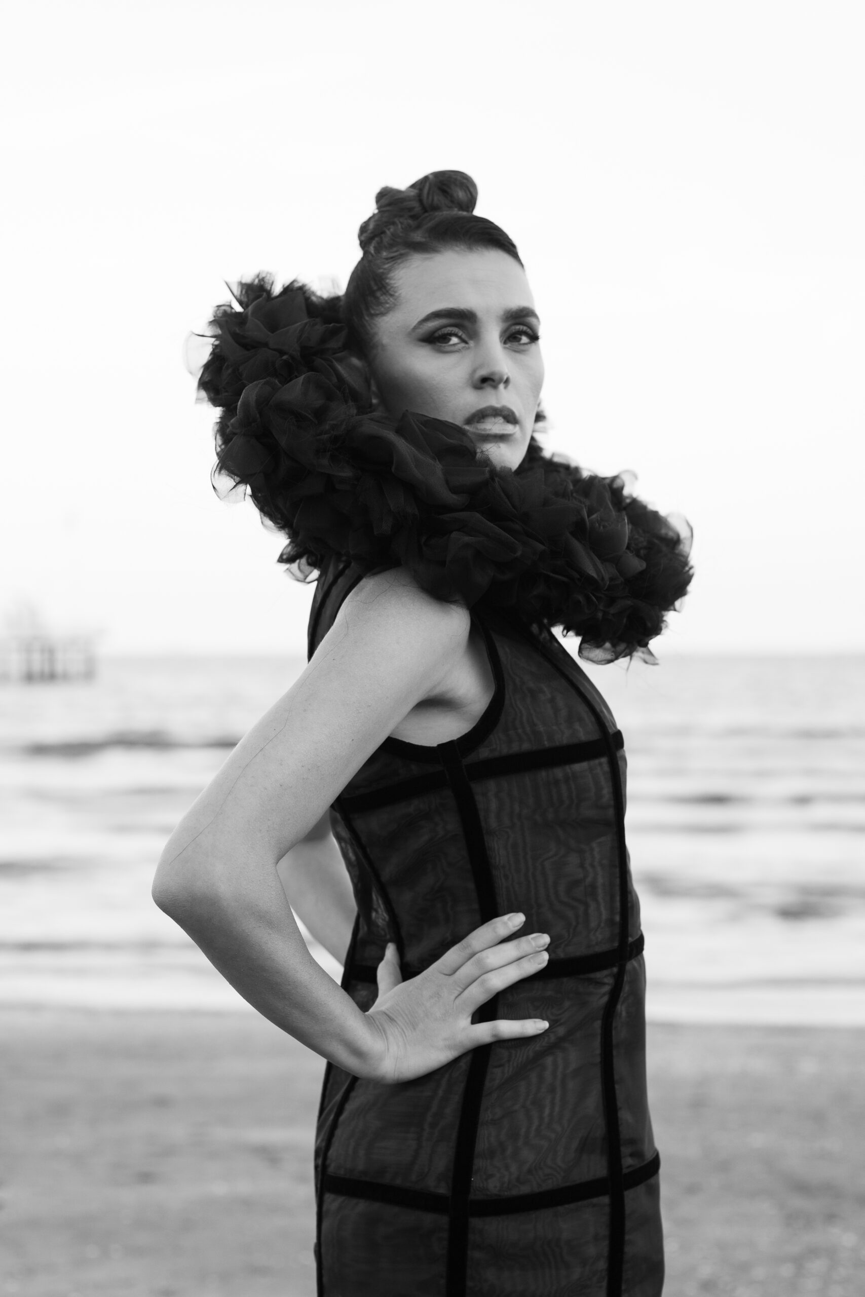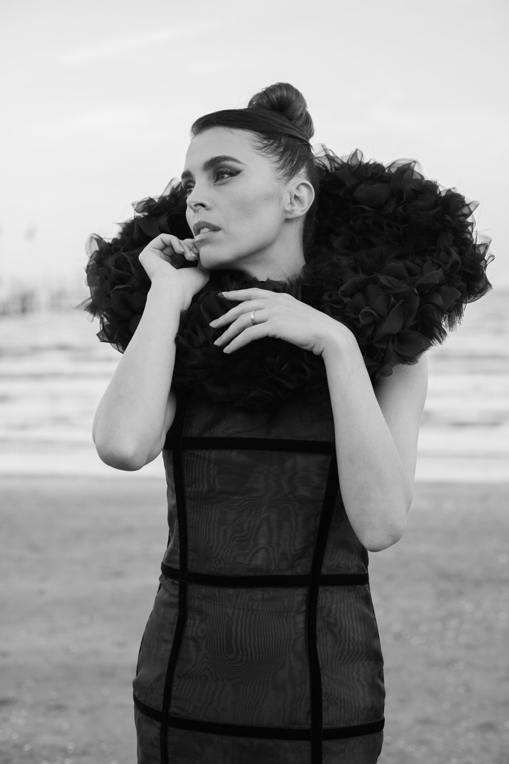 Davide Muccinelli, con il suo talentuoso team, desidera omaggiare tutte le donne con l’architettura di questa creazione di alta sartoria, dove organze di seta e velluti si fondono in geometrie che sbocciano in un armonico bouquet. L’abito “FLOS” si presenta come una gabbia dark che esplode nella parte superiore con un’elaborata realizzazione di ruches a taglio vivo, simulando i fili di seta che lo compongono.