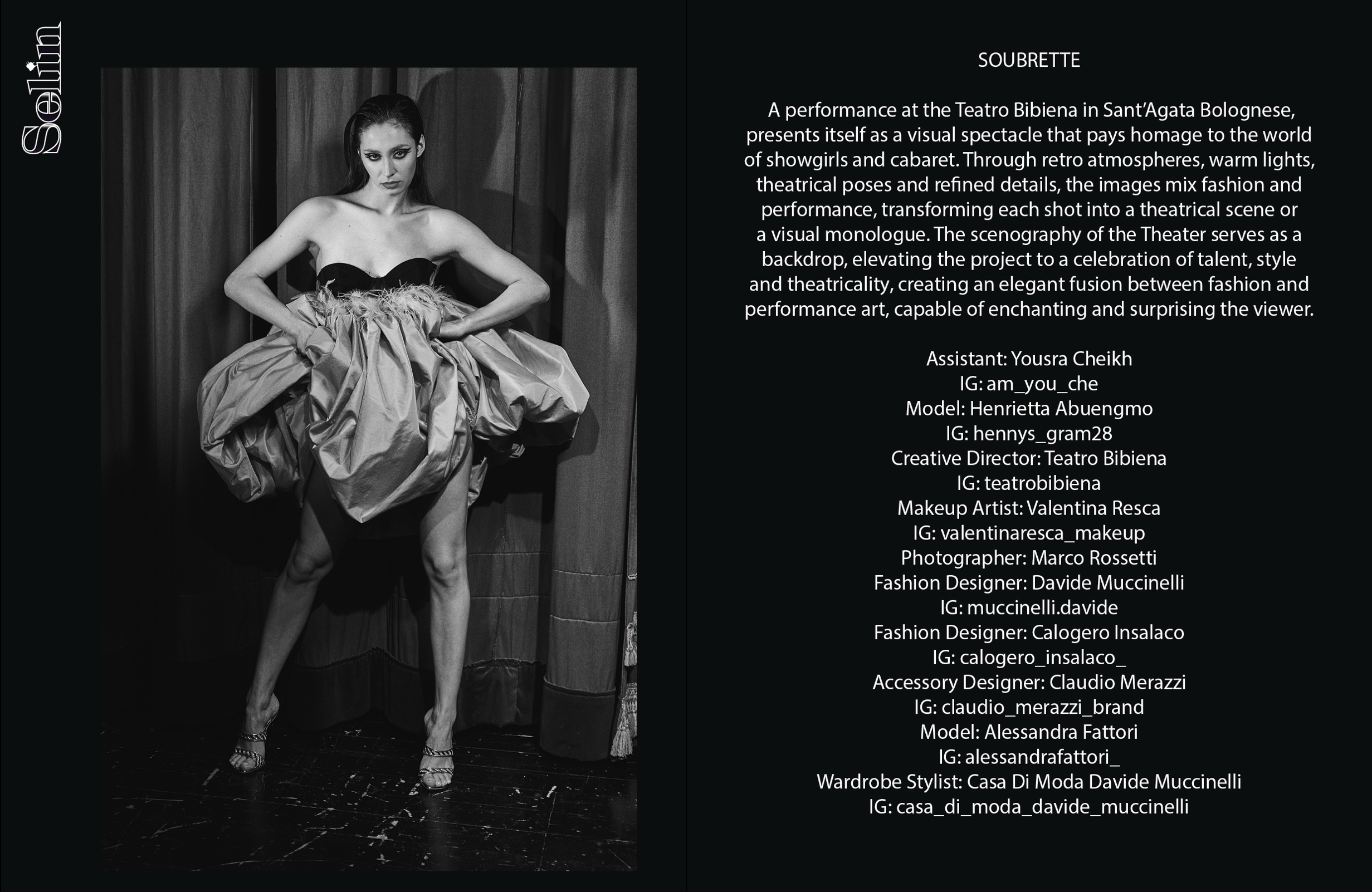 A performance at the Teatro Bibiena in Sant’Agata Bolognese, presents itself as a visual spectacle that pays homage to the world of showgirls and cabaret. Through retro atmospheres, warm lights, theatrical poses and refined details, the images mix fashion and performance, transforming each shot into a theatrical scene or a visual monologue. The scenography of the Theater serves as a backdrop, elevating the project to a celebration of talent, style and theatricality, creating an elegant fusion between fashion and performance art, capable of enchanting and surprising the viewer.