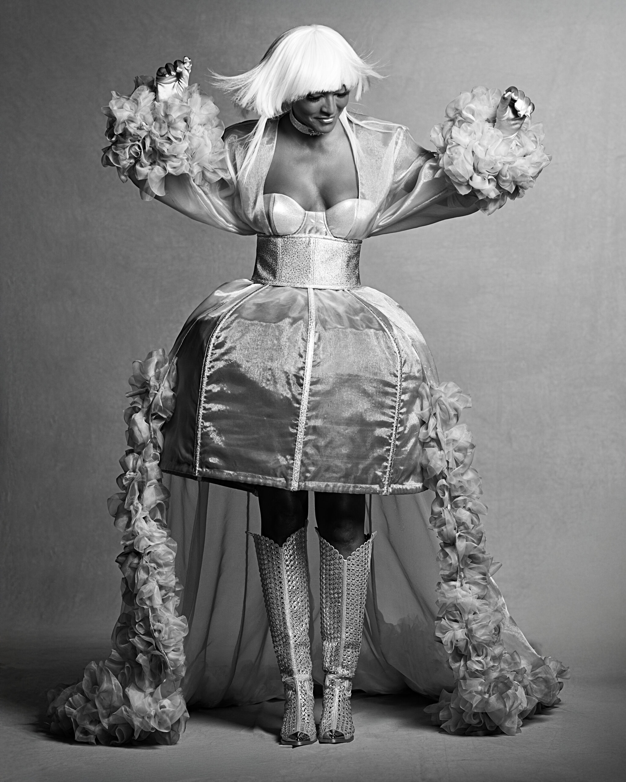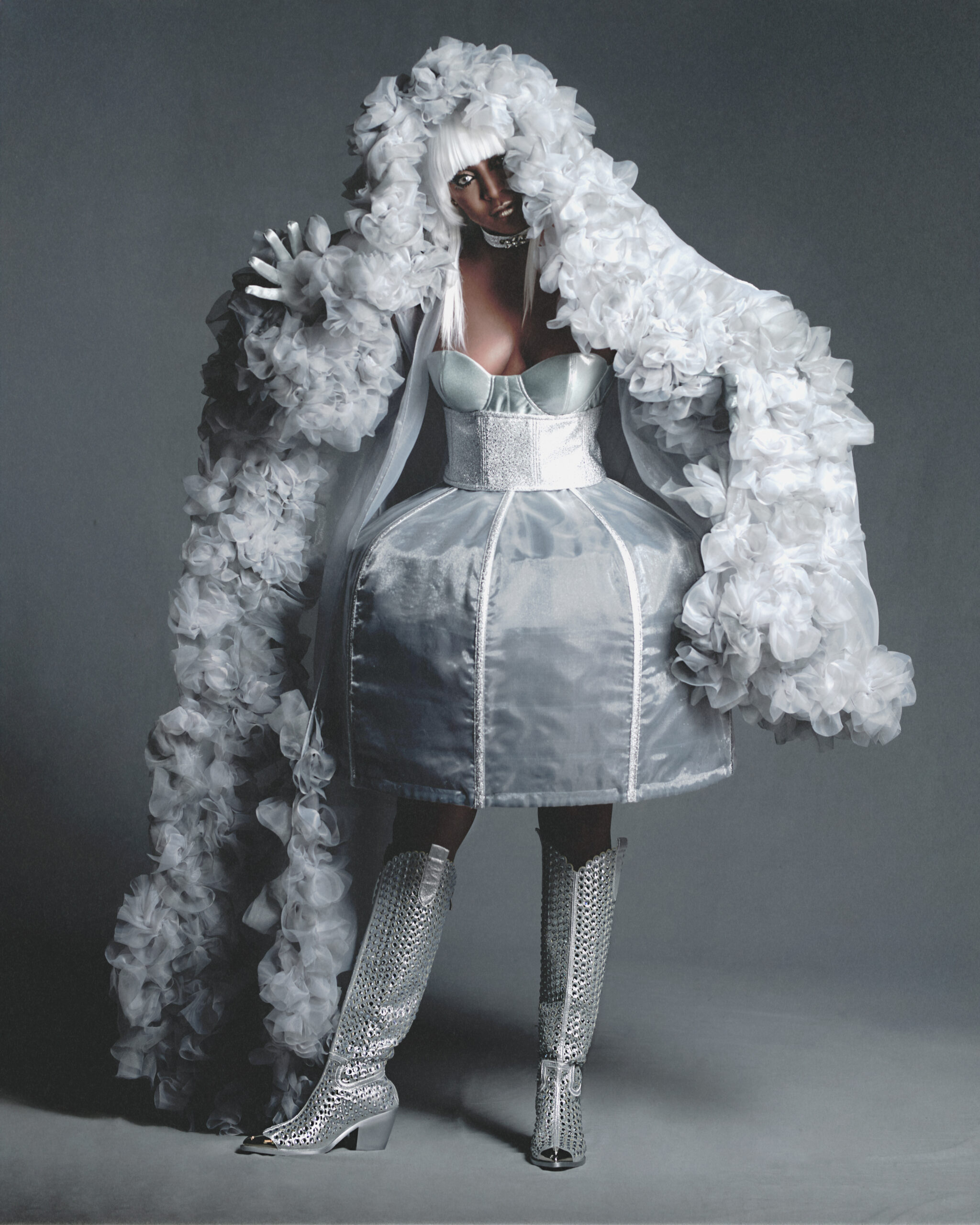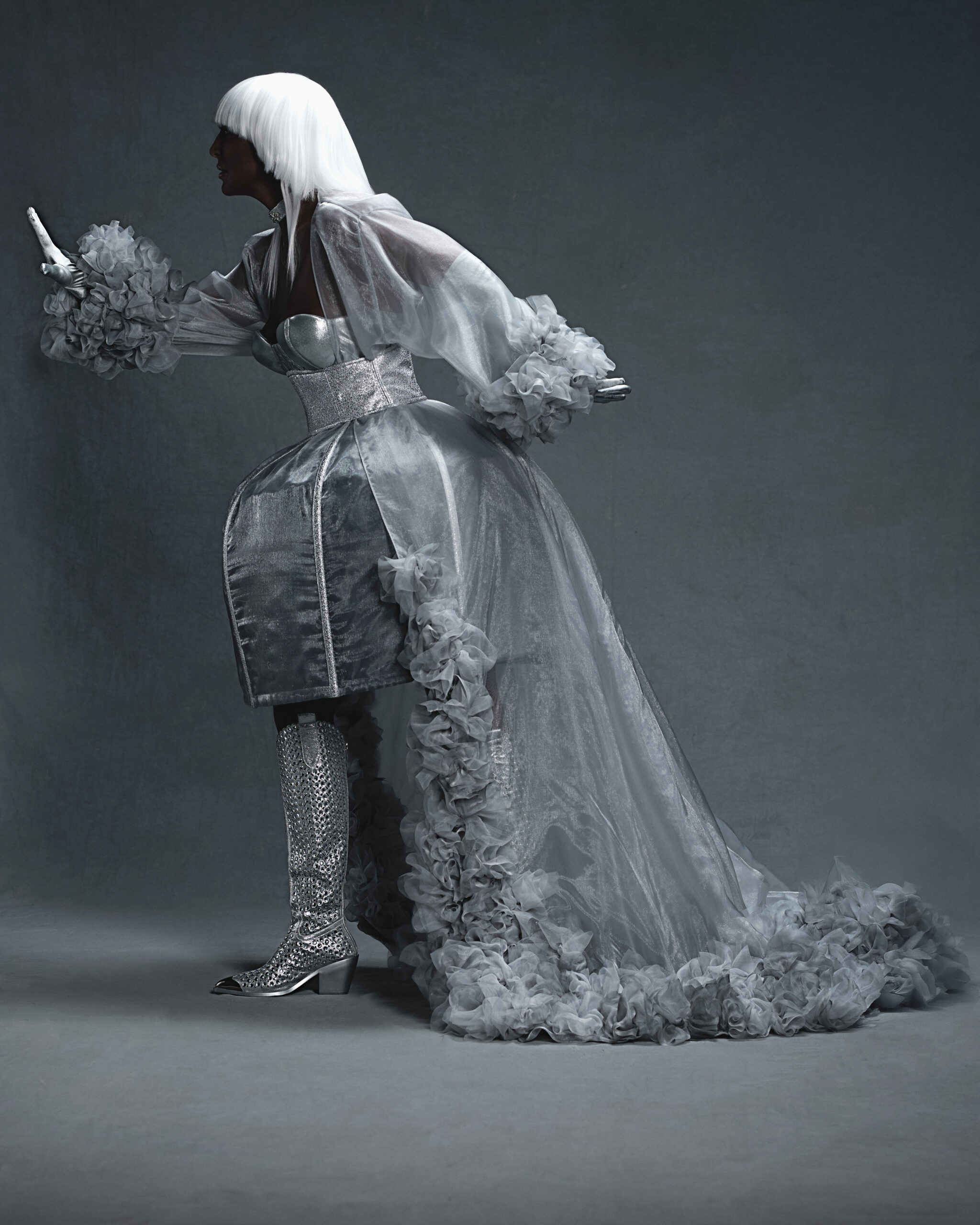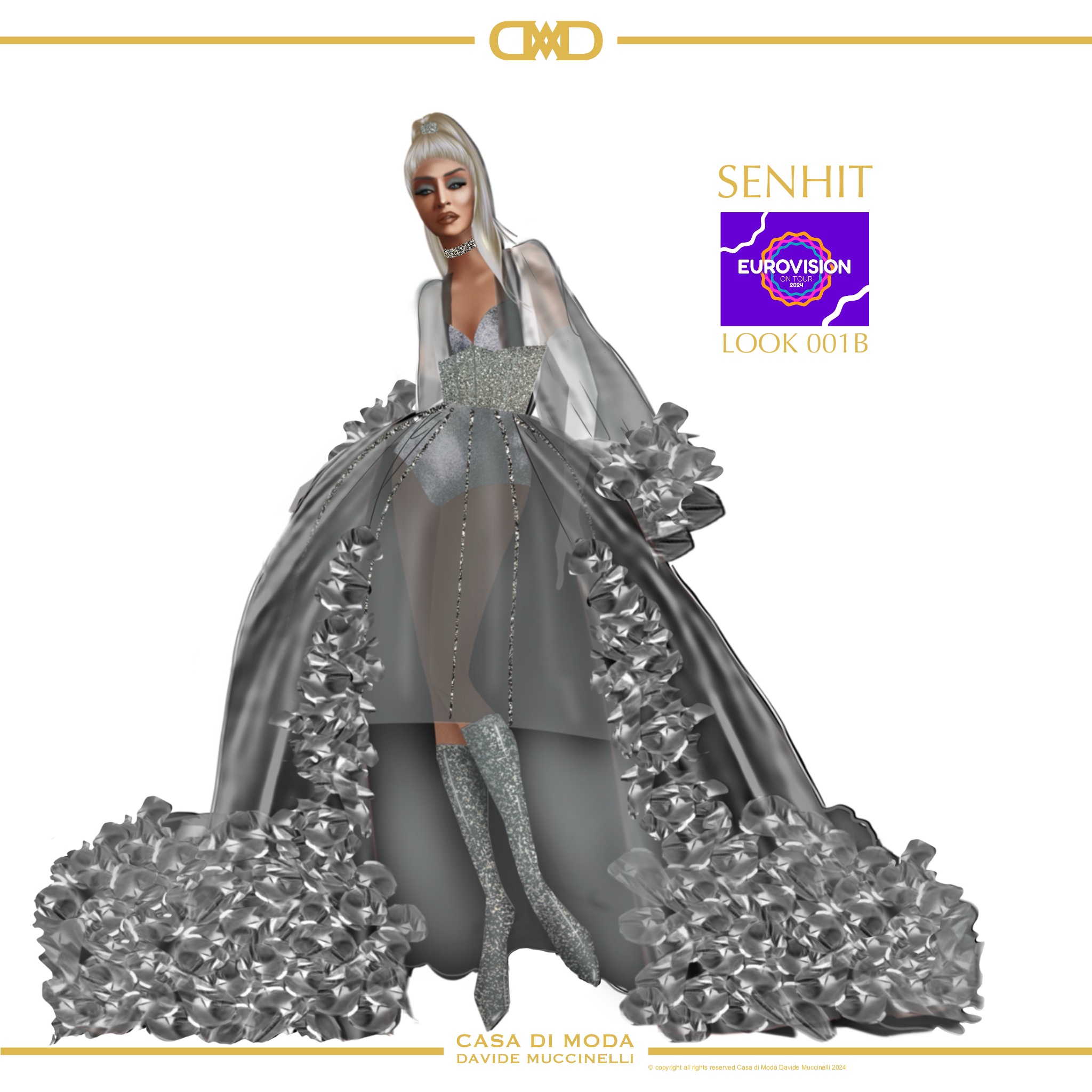 Per la Queen Senhit, un look in organza cangiante argento, come una nuvola o una regina senza tempo. Un abito bustier progettato e realizzato artigianalmente per delineare, con le sue semitrasparenze, l’elegante silhouette della poliedrica artista, incoronata da dettagli riflettenti e da una maestosa cappa rifinita con rouches che l’avvolge in modo impalpabile e regale. L’Alta Moda della Maison italiana si esprime in una serie di look progettati esclusivamente per la partecipazione dell’artista all’Eurovision Contest Tour, in qualità di cantante e presentatrice.